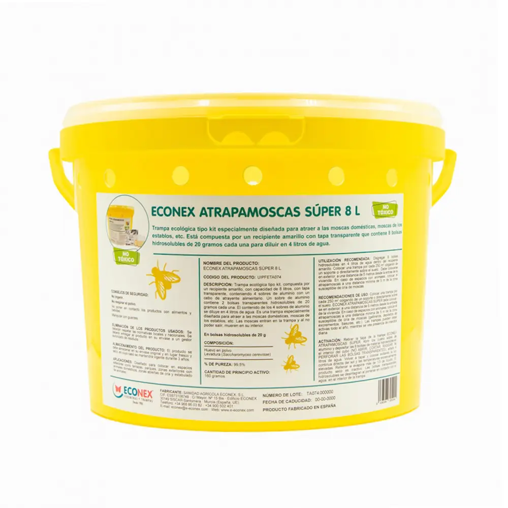 Trampa ecológica tipo kit, compuesta por un recipiente plástico, con un cebo de atrayente alimentario en bolsas hidrosolubles. Especialmente diseñada para atraer a la mosca común, moscas de los establos, etc.