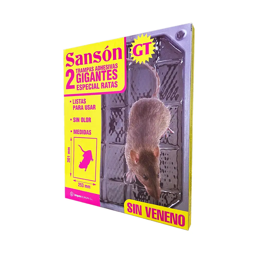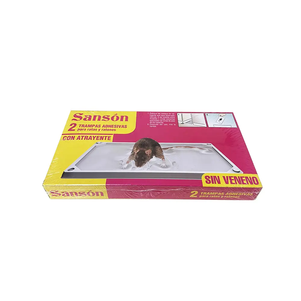 La trampa Sansón posee un alto poder adhesivo que atrapa ratas y ratones, gracias a que contiene una cola transparente de acción inmediata.